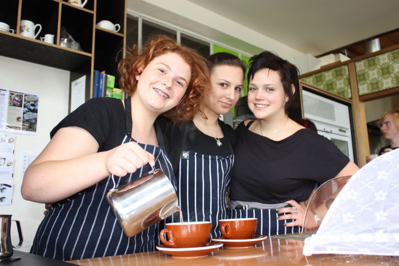 Pictured: Youth Grant recipients Stephanie O’Hanlon, Janette Emini and Vanessa Ravlich learning hospitality skills at the Victorian College for the Deaf Tradeblock Café.