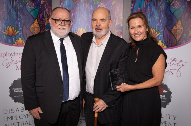 In a panel session on improving employment outcomes for young people with disability NOVA Employment CEO Martin Wren said he was concerned that aspects of service funding contain disincentives to full participation. “Service providers need to be held accountable for the number of minimum hour wages and the answer is to tell consumers the questions they need to ask such as: “How many people with my disability have you placed full or part time and how long do the positions you find last on average?” According to Wren this interrogation empowers service users and makes providers accountable. Wren was also presented with a Hall of Fame award for raising awareness well beyond the DES program and sector through his inauguration and development of the Focus on Ability Film Festival and its positive promotion of people with disability. (Pictured with DEA CEO Rick Kane and DEA chair Thérèse Campbell).